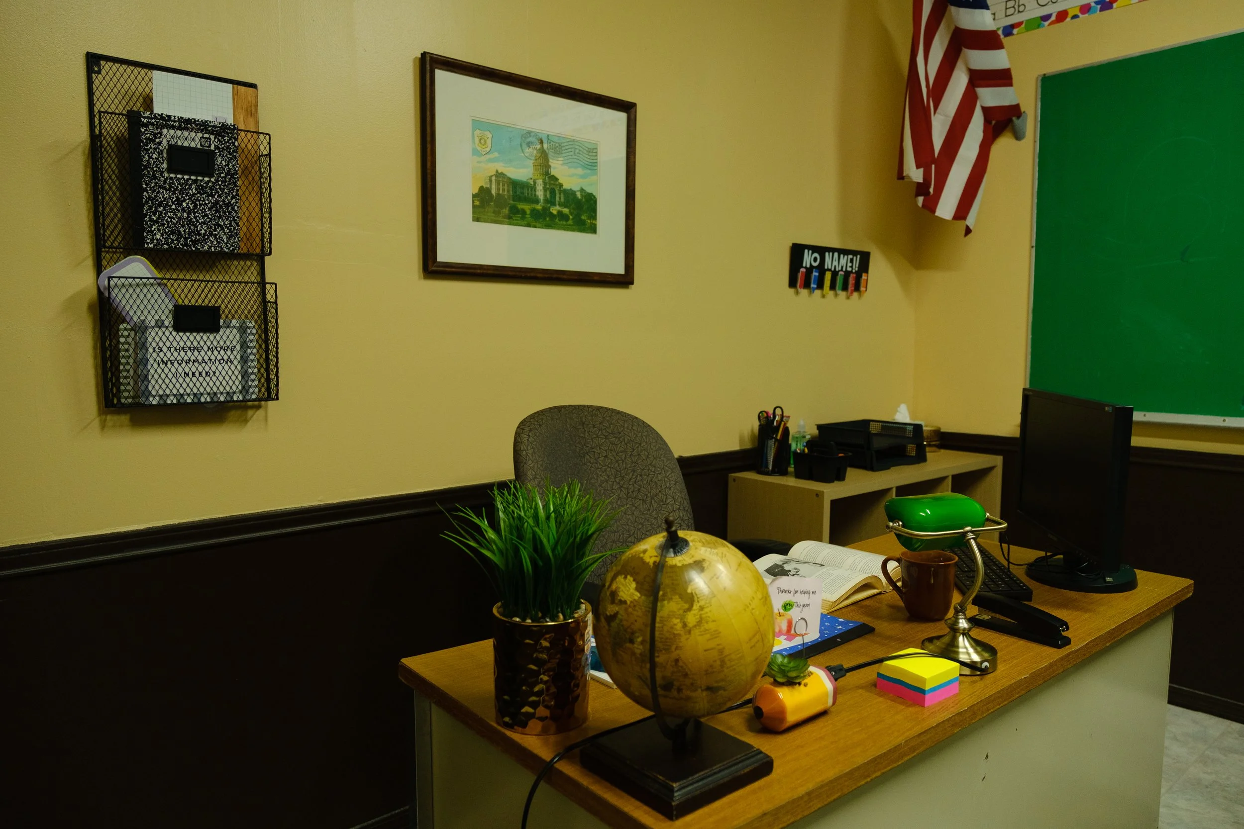 Features: Teacher’s desk, 6 student desks, chalkboard, 6-cube organizer with teacher supplies